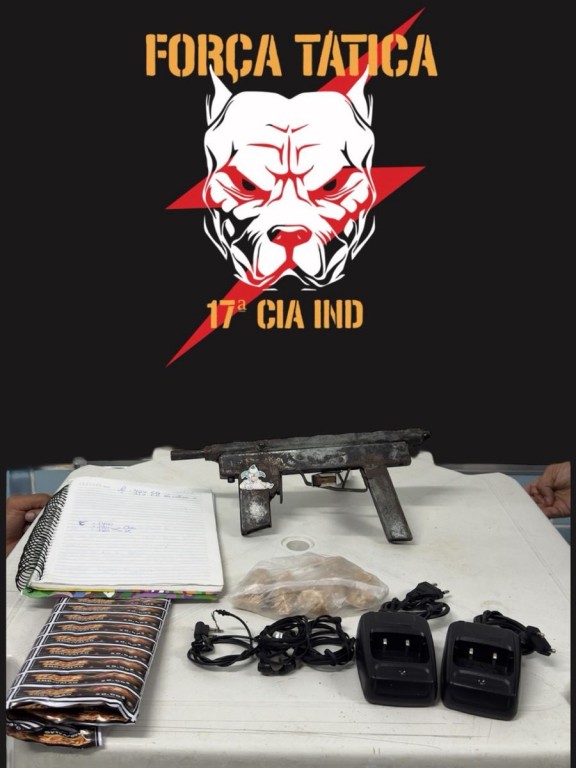 Já no bairro Zumbi dos Palmares, militares da Força Tática realizavam patrulhamento quando avistaram um indivíduo portando uma sacola preta, semelhante a saco de lixo. Ao perceber a aproximação dos militares, o suspeito empreendeu fuga a pé. Diante do fato, os militares iniciaram um acompanhamento. O homem dispensou a sacola no chão, conseguindo se evadir, não sendo possível alcança-lo. Os militares, ao verificarem o conteúdo da sacola encontraram uma submetralhadora calibre 380 de fabricação semi-industrial e seis pedras de crack, pesando aproximadamente 350g.