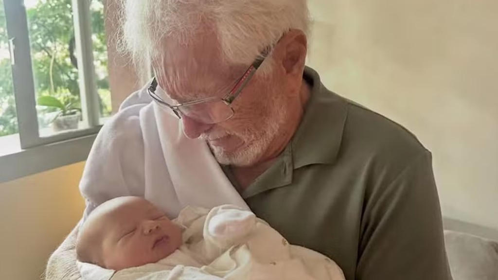 O apresentador e humorista Carlos Alberto de Nóbrega, de 90 anos, compartilhou neste sábado (11) uma foto emocionante do momento em que conheceu o bisneto