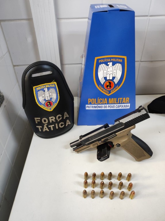 Em outra ação, dessa vez no Bairro de Fátima, a equipe de Força Tática recebeu a informação de que o condutor de um veículo, de cor branca, estaria em posse de uma arma de fogo. Diante da denúncia, o veículo foi localizado e abordado. Na busca pessoal e veicular, foi localizada uma pistola calibre 9mm com 18 munições.