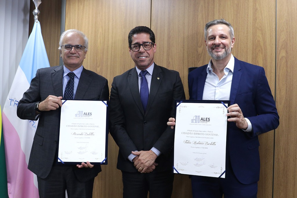 O presidente da Assembleia Legislativa (Ales), deputado Marcelo Santos (União), entregou na tarde desta terça-feira (10) o título de Cidadão Espírito-Santense para o presidente do Grupo Energisa, Ricardo Botelho, e para o diretor-presidente da ES Gás, Fabio Bertollo. A cerimônia ocorreu na sala de reuniões da Presidência.