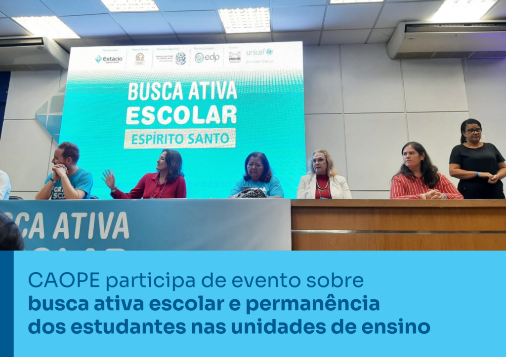 O CAOPE integra o Comitê Intersetorial de Busca Ativa Escolar no âmbito estadual e, por meio das ações previstas no Plano de Ação do Comitê, contribui com estratégias para a implementação dos comitês municipais, a recuperação da aprendizagem e o enfrentamento dos casos de evasão e abandono escolar.