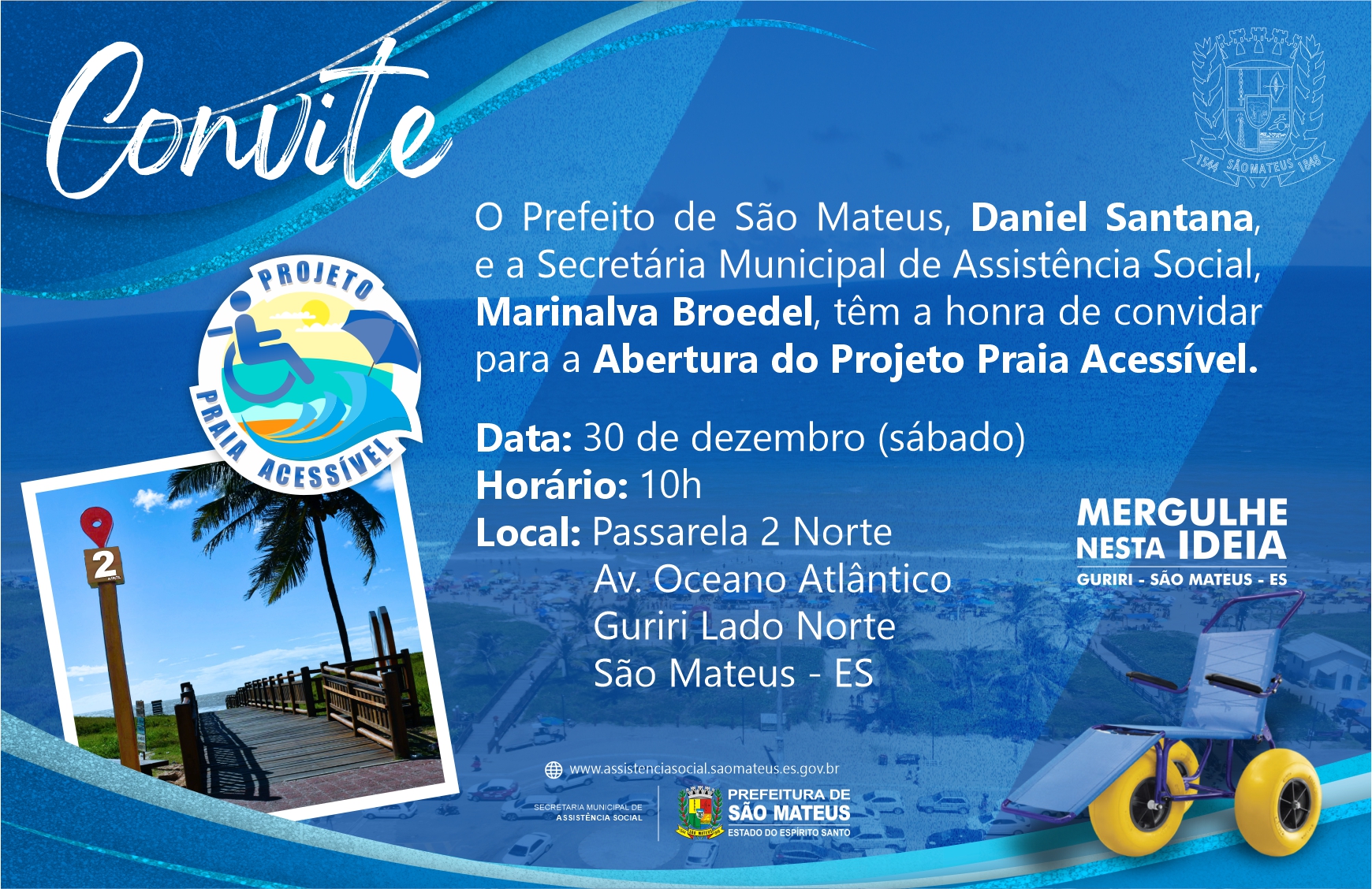 - O Prefeito de São Mateus, Daniel Santana, e a Secretária Municipal de Assistência Social, Marinalva Broedel, têm a honra de convidar para a Abertura do Projeto Praia Acessível.