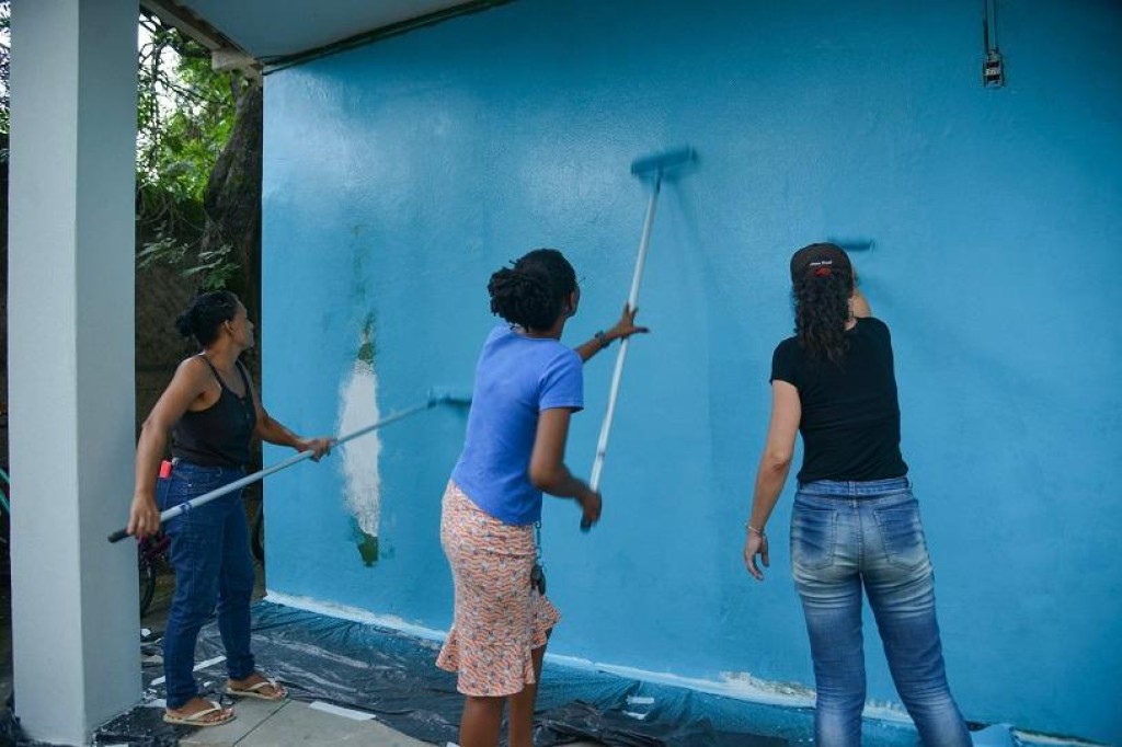 Como parte da aula final, as alunas estão realizando a pintura da fachada do Centro Social São José de Calasans, no bairro Vila Nova de Colares, colocando em prática tudo o que aprenderam durante o curso.