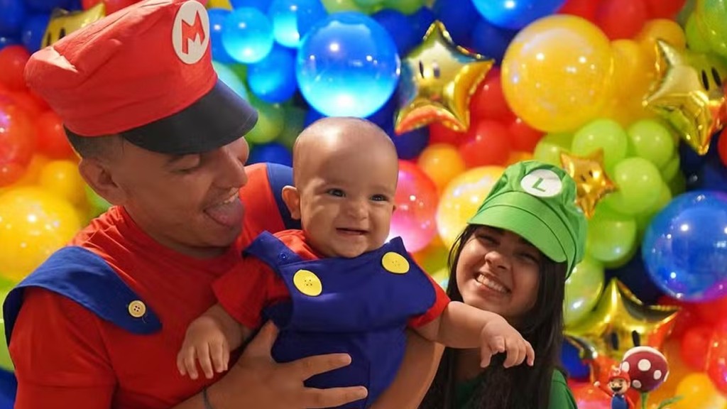 João Gomes e Ary Mirelle festejaram os 11 meses do filho, Jorge, com uma festa com tema do Super Mario Bros, nesta segunda-feira (16).