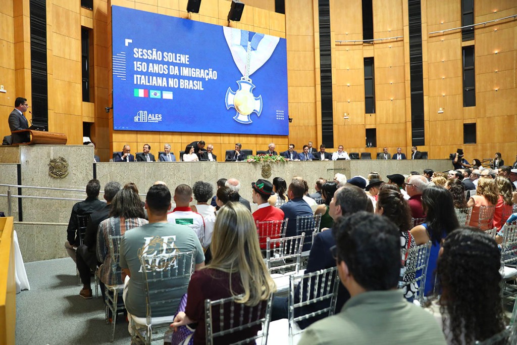O Plenário Dirceu Cardoso foi palco de comemoração, na tarde desta quinta-feira (17), dos 150 anos da imigração italiana no Espírito Santo, e, portanto, no Brasil. Com a presença do embaixador da Itália no Brasil, Alessandro Cortese, e do cônsul-geral da Itália no Rio de Janeiro, Massimiliamo Iacchini, o presidente da Assembleia Legislativa (Ales), deputado Marcelo Santos (União), pôde coordenar sessão solene para homenagear descendentes e entidades que valorizam e cuidam da identidade herdada do Bel Paese (belo país).