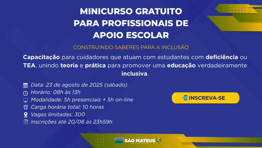 - A Prefeitura Municipal de São Mateus, por meio da Secretaria Municipal de Educação, realizará no dia 23 de agosto de 2025 a Formação para Profissionais de Apoio Escolar da Educação Especial – Construindo Saberes para a Inclusão.