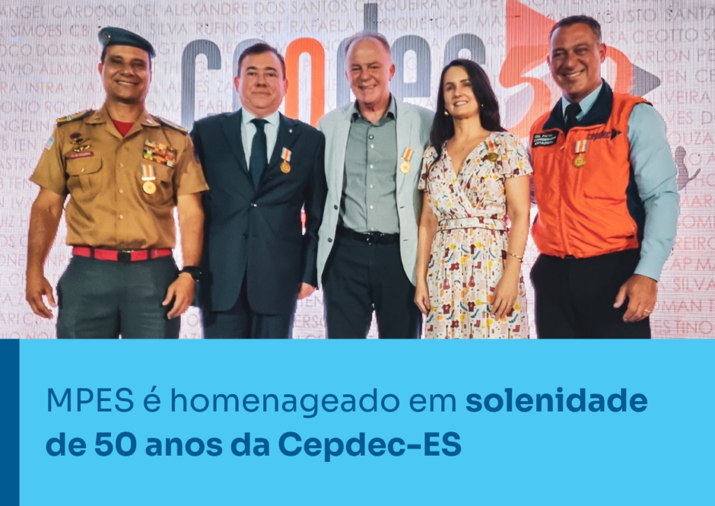 O Ministério Público do Espírito Santo (MPES) foi homenageado durante a solenidade do cinquentenário da Coordenadoria Estadual de Proteção e Defesa Civil (Cepdec-ES), nesta terça-feira (05), no Quartel do Comando Geral do Corpo de Bombeiros, em Vitória.