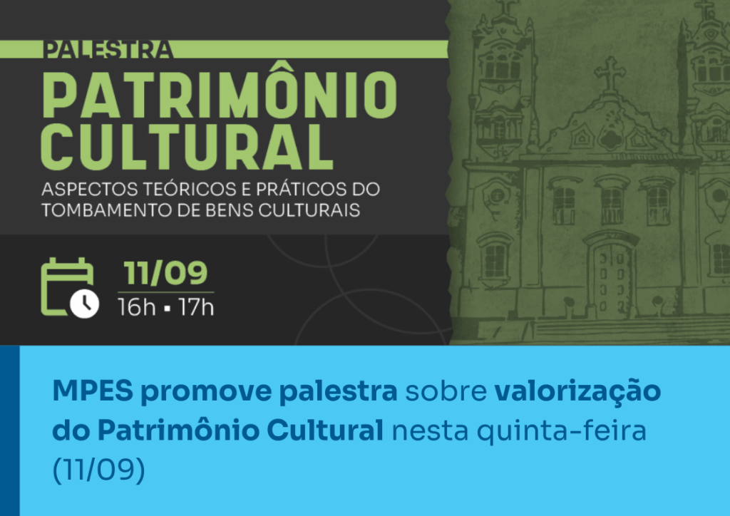 O Ministério Público do Estado do Espírito Santo (MPES), por meio da Coordenadoria Temática de Patrimônio Histórico-Cultural (CPHC) e do Centro de Estudos e Aperfeiçoamento Funcional (CEAF), realizará, nesta quinta-feira (11/09), a palestra “Patrimônio Cultural: Aspectos Teóricos e Práticos do Tombamento de Bens Culturais”. O evento acontecerá de forma virtual, pela plataforma Microsoft Teams, das 16h às 17h.
