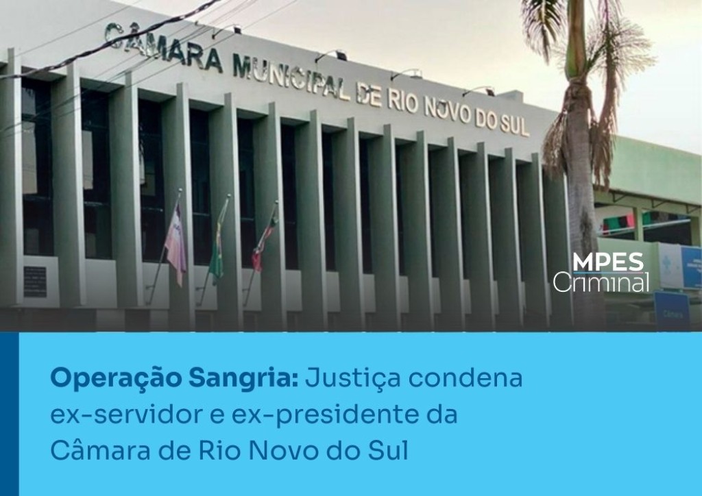 O Ministério Público do Estado do Espírito Santo (MPES) obteve a condenação de um ex-servidor e do ex-presidente da Câmara Municipal de Rio Novo do Sul investigados na Operação Sangria, deflagrada em março por meio da Promotoria de Justiça do município e do Grupo de Atuação Especial de Combate ao Crime Organizado (GAECO-Sul). A operação apurou desvios de recursos públicos, fraudes em folhas de pagamento, adulterações no Portal da Transparência e falta de repasses previdenciários que somaram centenas de milhares de reais em prejuízos ao erário municipal.