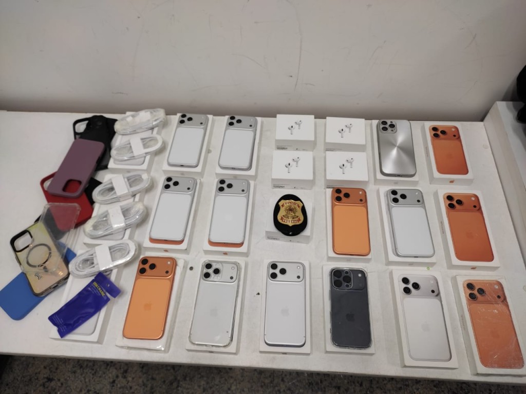 Foram apreendidos 11 aparelhos telefônicos, 5 fones sem fio e 20 caixas vazias de telefone celular, todos sem documentação fiscal. A passageira foi conduzida à sede da Polícia Federal para os procedimentos cabíveis e poderá responder pelo crime de descaminho.
