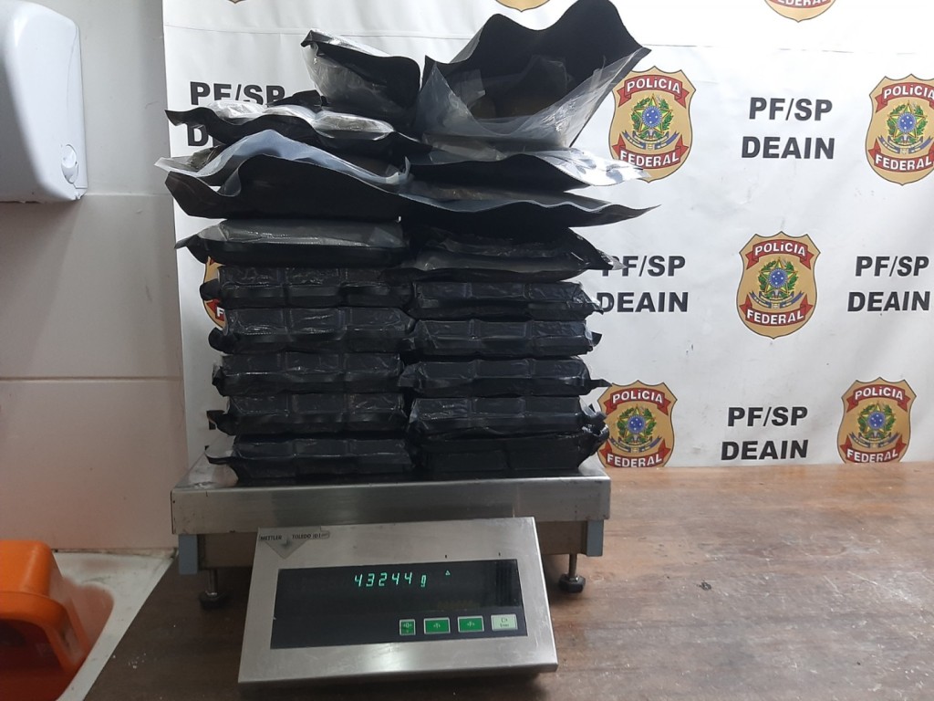 Na delegacia da PF, os peritos federais confirmaram as suspeitas e identificaram a substância como haxixe, cujo volume total somou mais de 43 Kg.