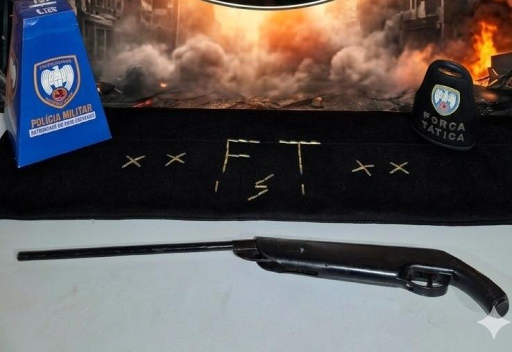 Durante a averiguação na área externa do imóvel, os policiais localizaram uma carabina calibre 22, acompanhada de 40 munições do mesmo calibre.