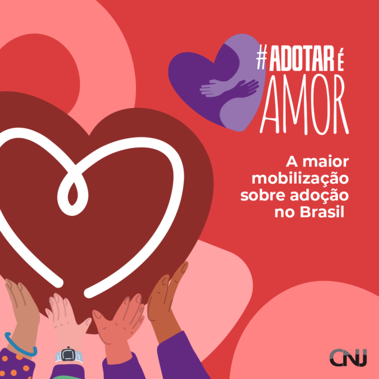 Esta matéria possui recursos de texto alternativo para promover a inclusão das pessoas com deficiência visual. Descrição da imagem: arte nas cores vermelho roxo e branco, com a hashtag #AdotarÉAmor e a frase “A maior mobilização sobre adoção no Brasil”. Ao lado da hashtag, há o desenho de dois braços que se abraçam dentro de um formato de coração. No lado esquerdo, o desenho de várias mãos erguendo um coração. O CNJ assina a arte. Segunda imagem: arte em tons pasteis, com o convite para a programação da Semana da Adoção promovida pela Ampara, IBDFAM e Poder Judiciário (cujas logomarcas aparecem na parte inferior).