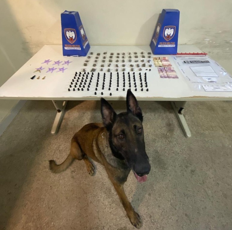 Na sexta-feira (21), os militares abordaram um cidadão com mandado de prisão por tráfico de drogas, no bairro Itapebussu. Em outra ação, no bairro Nossa Senhora da Conceição, equipes flagraram um indivíduo que, ao perceber a presença policial, abandonou uma sacola no local, onde foram encontradas oito buchas de maconha e duas pedras de crack. Com apoio do cão policial Lobo foi possível localizar um depósito contendo 40 buchas de maconha, duas unidades pequenas de haxixe, 99 pedras de crack e 33 pinos de cocaína.