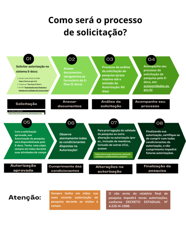 A solicitação deve ser encaminhada por pesquisadores com vínculo empregatício em instituições de pesquisa ou pós-doutores, desde que indiquem um corresponsável vinculado. Também podem solicitar a autorização, pesquisadores vinculados a instituições e organizações não governamentais, sejam eles do Espírito Santo, de outros estados ou até mesmo do exterior.