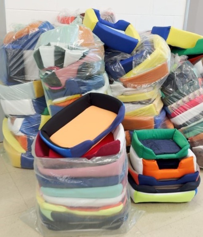 Internos da Penitenciária Estadual de Vila Velha 2 (PEVV2) e Penitenciária Estadual de Vila Velha 6 (PEVV6), que ficam no Complexo Penitenciário Eduardo Pereira da Silva, no Xuri, atuaram na confecção das camas pets. As peças são feitas com o reaproveitamento de tecidos que são descartados das fábricas de costura existentes no local e com a doação de tecidos de empresas parceiras. Somente este ano, as unidades já confeccionaram cerca de 1.300 camas pets que foram doadas a projetos sociais.