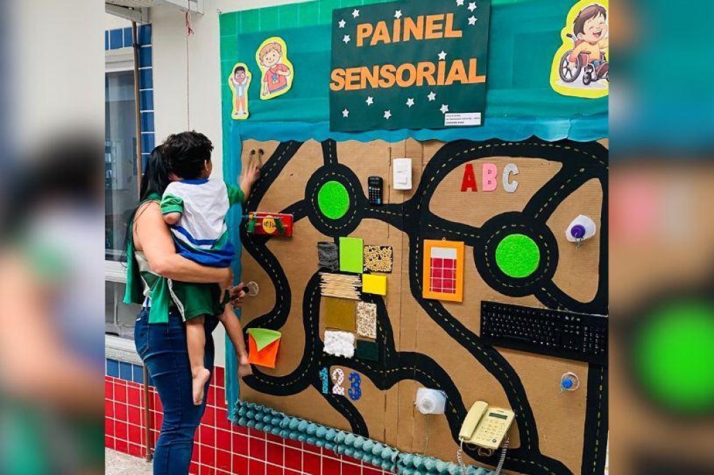 Para celebrar o Setembro Verde, mês dedicado à conscientização sobre a inclusão de pessoas com deficiência, o Centro Municipal de Educação Infantil (Cmei) Geanderson Jesuíno dos Santos, no bairro Vista do Mestre, criou um painel e um corredor sensoriais. O objetivo das instalações é promover o respeito às diferenças, a integração entre as crianças e o combate ao preconceito desde os primeiros anos da vida escolar.