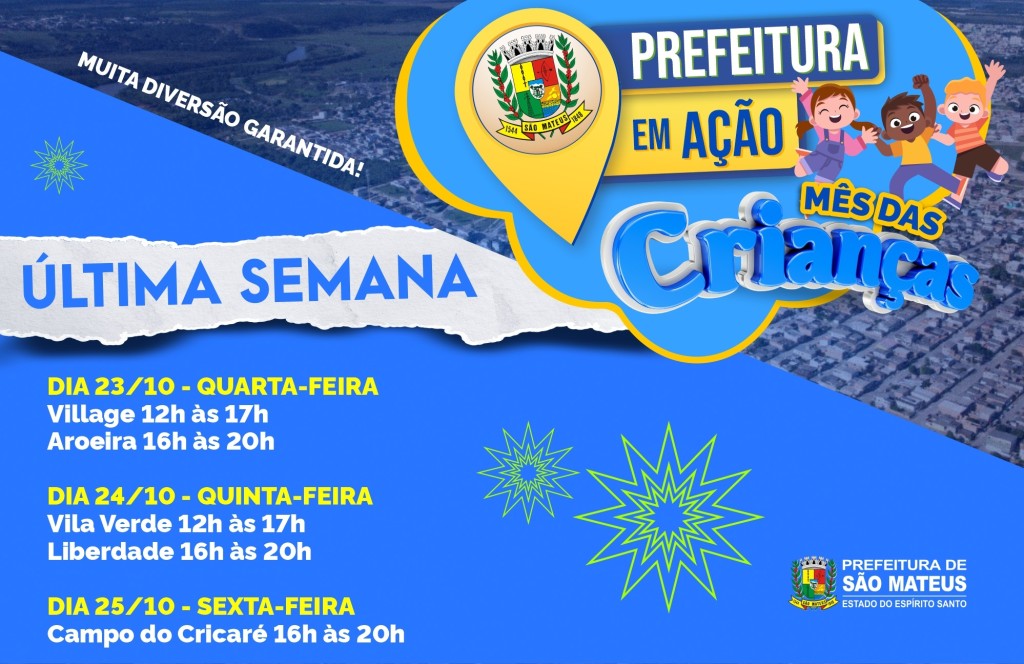 - A Prefeitura de São Mateus deu início no último dia 12 de outubro, o projeto “Prefeitura em Ação: Mês das Crianças”, que transforma o mês de outubro em uma grande festa para os pequenos. Com atividades programadas até o dia 25 de outubro, das 12h às 20h, a iniciativa visa proporcionar momentos de lazer e alegria para as crianças de diversos bairros da cidade, além de atender também as comunidades vizinhas.
