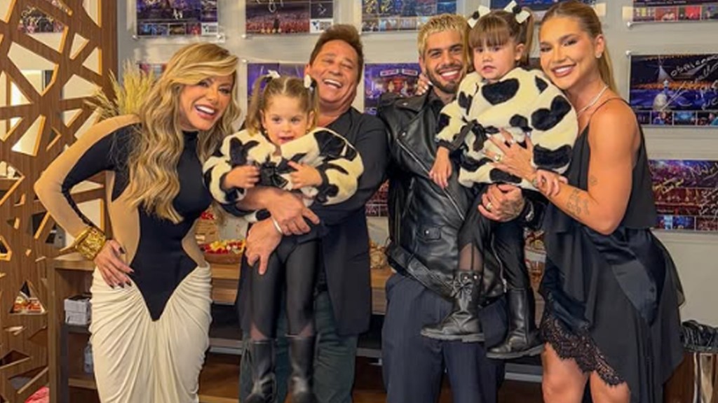 Virginia Fonseca, de 26 anos, aproveitou a noite de quinta-feira (22), ao lado da família durante a gravação do DVD Uma História Sem Fim, do sogro Leonardo, em São Paulo. Acompanhada do marido, Zé Felipe, e das filhas Maria Alice e Maria Flor, posou sorridente com outros membros da família.