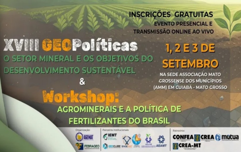 Na próxima segunda-feira (01.09) Cuiabá será palco de um evento que promete reunir especialistas, gestores públicos, acadêmicos e representantes da sociedade civil para debater temas estratégicos para o futuro da agricultura e da mineração no país. Trata-se da programação integrada do Workshop: Agrominerais e a Política de Fertilizantes do Brasil e do XVIII GEO Políticas: O Setor Mineral e os Objetivos do Desenvolvimento Sustentável, promovida pela Federação Brasileira de Geólogos (Febrageo) e entidades regionais.